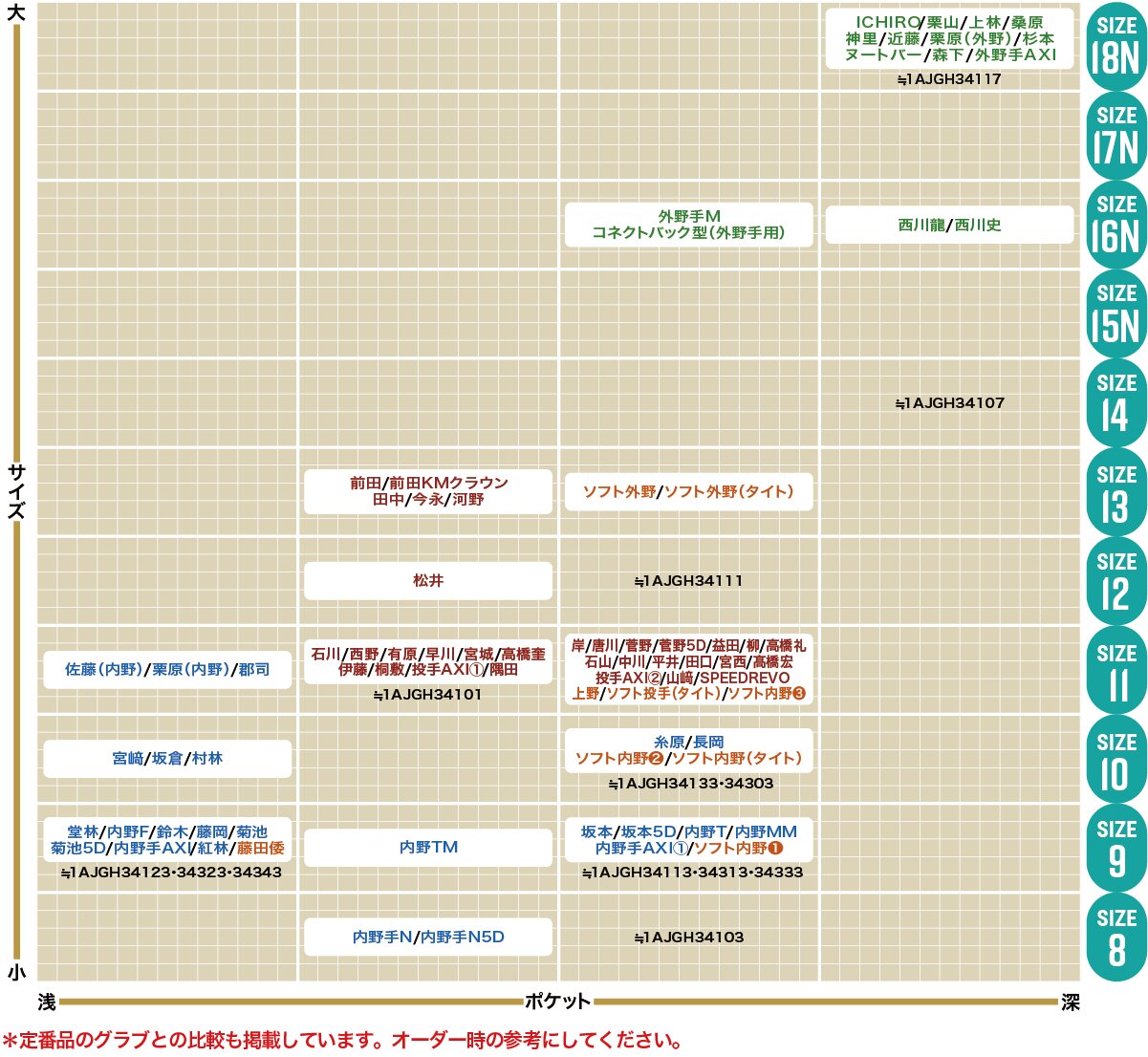 投手用/内野手用/外野手用/ソフトボールグラブサイズ目安表