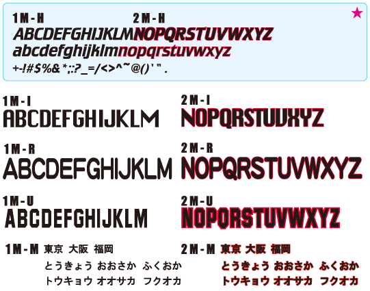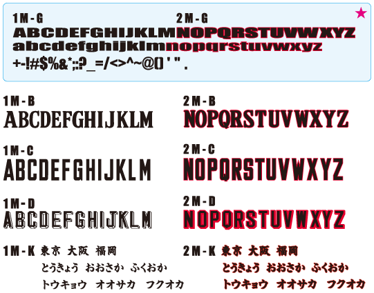 チーム名の大きさのご指定はご遠慮願います。 - ●チーム名を上の3ヶ所のマーク位置より1ヶ所・1書体をお選びください。